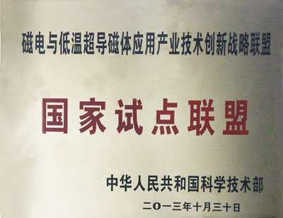 近日,公司收到由國(guó)家科技部頒發(fā)的“磁電與低溫超導(dǎo)磁體應(yīng)用產(chǎn)業(yè)技術(shù)創(chuàng)新戰(zhàn)略聯(lián)盟”匾牌。這是對(duì)公司擔(dān)任聯(lián)盟理事長(zhǎng)單位工作的支持和肯定。