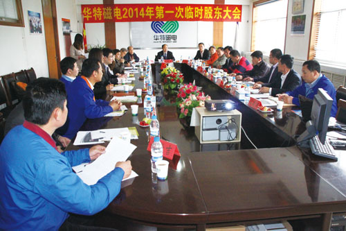 4月26日,山東華特磁電科技股份有限公司召開了2014年度第一次臨時股東大會。公司股東及董事、監(jiān)事、高管參加會議,董事長兼總裁王兆連主持會議。