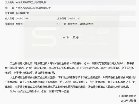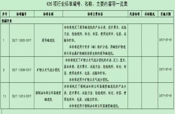 2017年7月1日,由華特磁電主持制定的《JB/T 13013-2017強制油冷卻立環(huán)高梯度磁選機》、《JB/T 13008-2017礦物氣流分級機》、參與制定的《JB/T 13002-2017超導(dǎo)磁選機》等3項行業(yè)標(biāo)準由國家工業(yè)和信息化部正式頒布實施。截至目前,華特磁電已累計主持制定和參與制定行業(yè)標(biāo)準達16項。