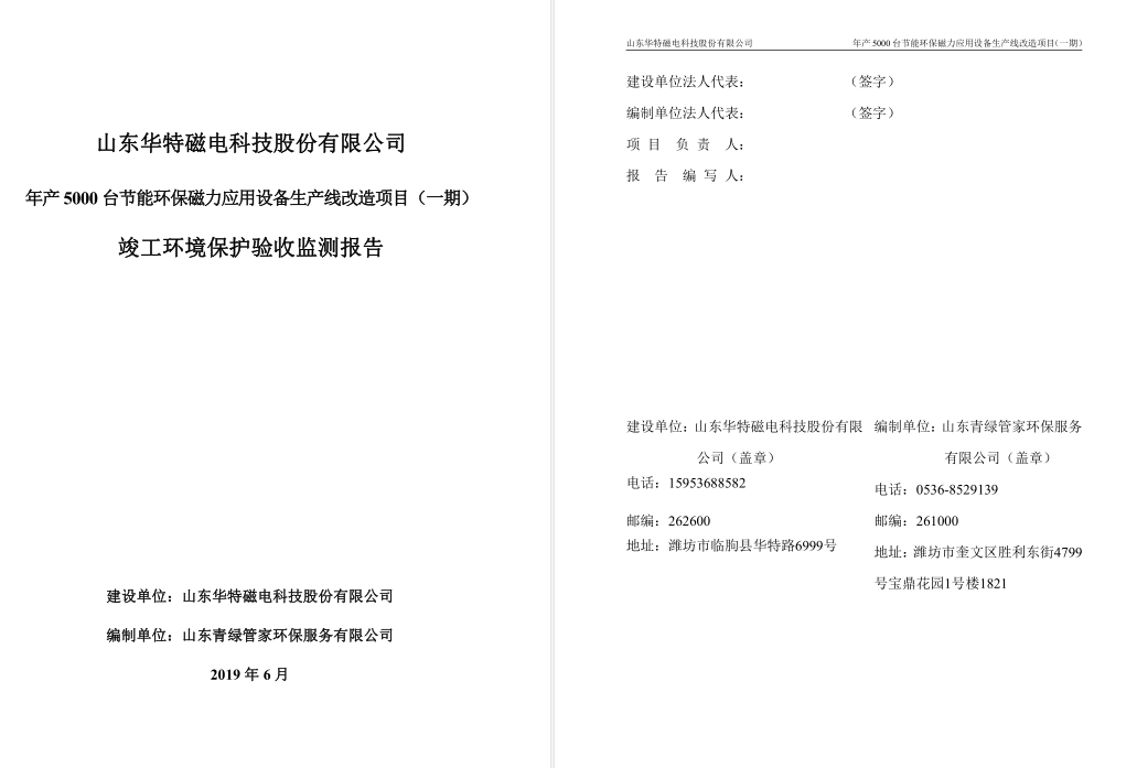 山東華特磁電科技股份有限公司年產(chǎn)5000 臺節(jié)能環(huán)保磁力應用設備生產(chǎn)線改造 項目(一期)竣工環(huán)境保護驗收監(jiān)測報告