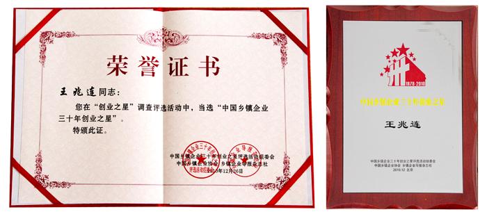 為表彰對鄉(xiāng)鎮(zhèn)企業(yè)發(fā)展做出突出貢獻(xiàn)的企業(yè)領(lǐng)軍人物,樹立行業(yè)典范,促進(jìn)鄉(xiāng)鎮(zhèn)企業(yè)持續(xù)健康快速發(fā)展,經(jīng)鄉(xiāng)鎮(zhèn)企業(yè)導(dǎo)報雜志社提名,人民日報人民網(wǎng)、中國鄉(xiāng)鎮(zhèn)企業(yè)協(xié)會的大力支持,聯(lián)合首都多家新聞媒體,經(jīng)網(wǎng)絡(luò)民意初選,綜合評選組委會權(quán)威專家意見,通過程序報請批準(zhǔn),公司董事長兼總經(jīng)理王兆連被評為“中國鄉(xiāng)鎮(zhèn)企業(yè)三十年創(chuàng)業(yè)之星”。