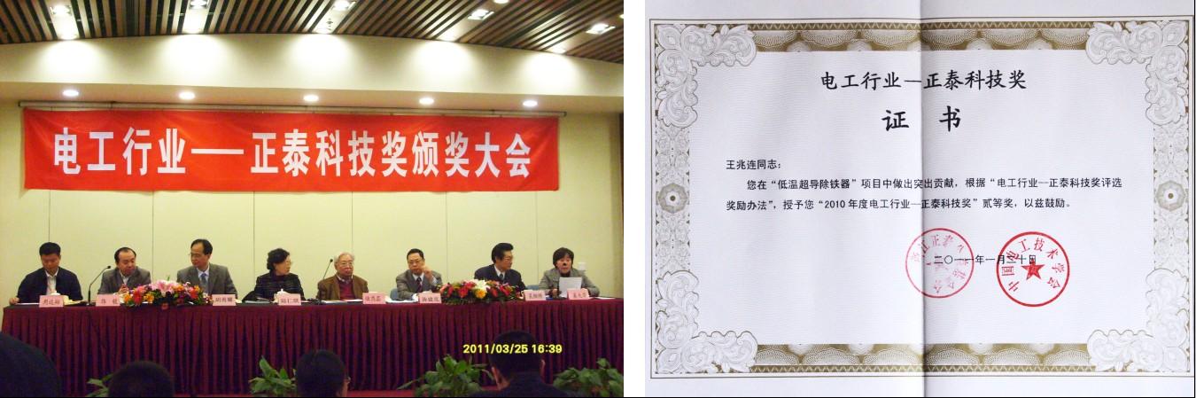 2011年3月25日,2010年度“電工行業(yè)——正泰科技獎”頒獎大會在北京中國科技會堂舉行。我公司董事長、總經理王兆連以其率領團隊在研發(fā)超導除鐵器上的貢獻獲此殊榮。