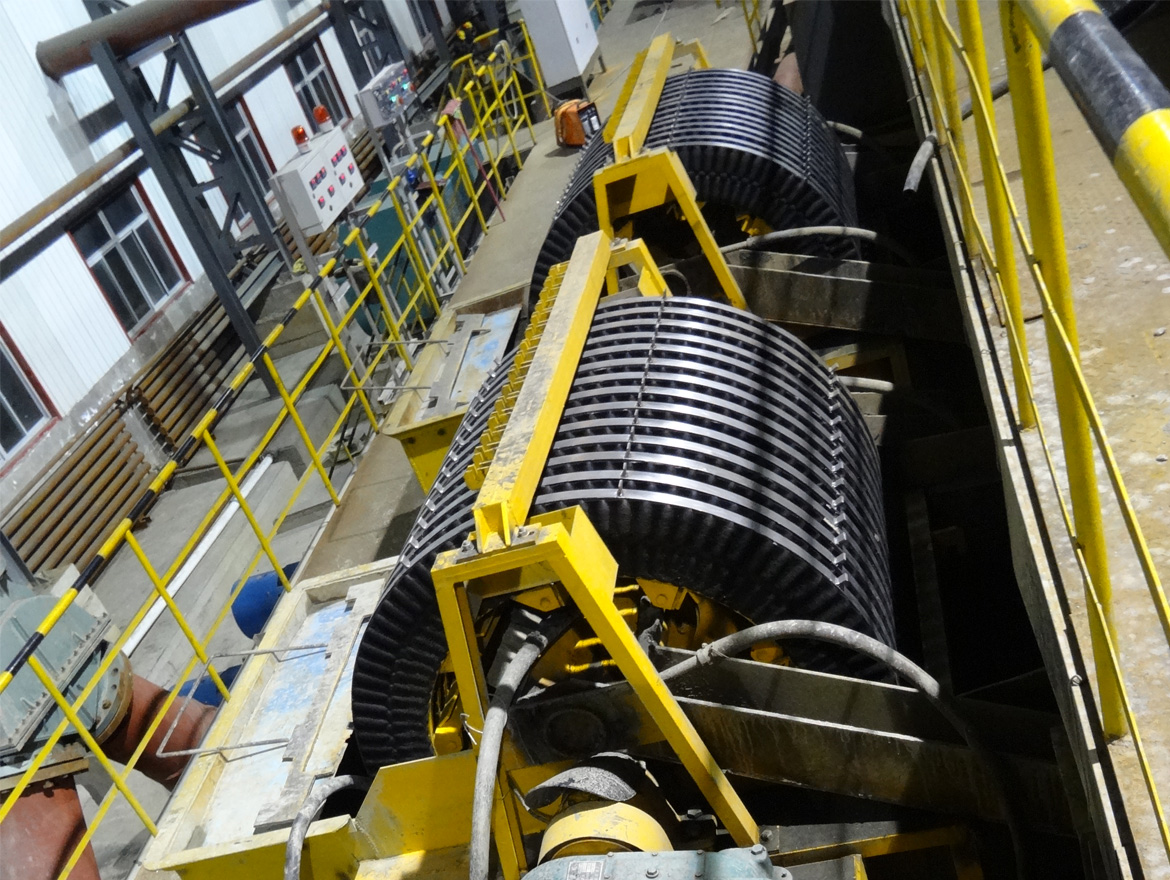 YCW系列無水卸料回收機是我公司根據(jù)國外先進經驗研制開發(fā)的一種新型產品。該磁系采用一組由外裸磁塊鑲嵌而成的磁環(huán),按照一定間隙排列而成。該磁系直接作用磁性物料,磁場強度高,作用梯度大,回收率可高達85%-95%,特別是采用V形刮板,借助磁性物料自身重量,實現(xiàn)了無水或少水一次卸料。