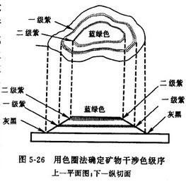 觀察礦物邊緣的色圈可以判斷干涉色的級、序,因為紫色出現(xiàn)在各級序的末尾,所以紫色色圈出現(xiàn)的次數(shù)加1即為顆粒的干涉色級序,加上顆粒中央的干涉色就是該顆粒的干涉色。如某礦物獲拉中央為藍綠干涉色,顆粒邊緣出現(xiàn)兩圈紫色色圈,所以該顆粒的干涉色是三級藍綠,相當于光程差R在1 250-1 300 nm之間。