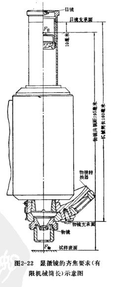 直筒式金相顯微鏡中,卻下物鏡筒和目鏡筒后所剩下的鏡筒長(zhǎng)度,即物鏡支承面和目鏡支承面之間的距離稱為金相顯微鏡的機(jī)械筒長(zhǎng),如圖2-22,顯微鏡機(jī)械筒長(zhǎng)分為有限和任意兩種。有限機(jī)械筒長(zhǎng)的數(shù)值各國(guó)都有自己的規(guī)定,一般在160-190毫米范圍之內(nèi),在“金相顯微鏡下的試片研究”內(nèi)容中有介紹。我國(guó)規(guī)定為160毫米。物鏡和目鏡的相對(duì)位置應(yīng)該使顯微鏡滿足齊焦要求:在金相顯微鏡使用過(guò)程中,調(diào)換物鏡或目鏡時(shí)不需要重新調(diào)焦就基本上能看清楚試樣,此外,調(diào)換物鏡后能使試樣上被觀察目標(biāo)仍然保持在視場(chǎng)中心。