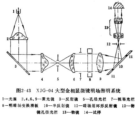 XIG-04大型金相顯微鏡也是按任意機(jī)械筒長(zhǎng)設(shè)計(jì)的,它的照明系統(tǒng)和XIL-02立式金相顯微鏡原則上相同。圖2-43是XJG-04大型金相顯微鏡明場(chǎng)照明系統(tǒng)示意圖。只要將圖2-43與圖2-42對(duì)比,就容易看出它也屬于明場(chǎng)柯拉照明。