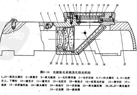 光源聚光鏡組由聚光鏡片27, 25, 23組成(圖3-16),按次排列在聚光鏡座內(nèi)。其中鏡片27,25分別由前后聚光鏡墊圈26, 24隔開,這些鏡片和墊圈均靠加工有級紋的聚光鏡壓圈22壓緊在聚光鏡座內(nèi)。照明燈組發(fā)出的光線,經(jīng)過聚光鏡組后成為錐形光束,經(jīng)反射鏡21的反射通過孔徑光欄射出。反射鏡和它后面的墊紙,靠反射鏡托板18壓緊,并用圓頭級釘19與聚光鏡座3緊固,結(jié)構(gòu)比較筒單,拆裝都很方便。