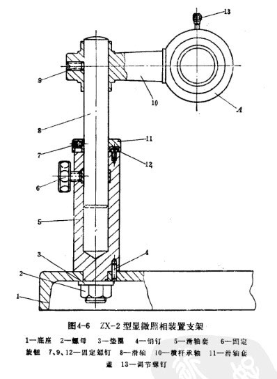 圖4-6是ZX-2型顯微照相裝置支架,金相顯微鏡主體安放在它的底座上,攝影裝置靠橫桿承軸支承。