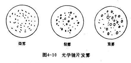 偏光顯微鏡的光學零件表面,有時會呈現(xiàn)象微小“露水”似的一層物質(zhì),這些物質(zhì)有的是水滴或礦物鹽的水溶液,有的是在水溶液上覆蓋了油脂層。不論它以“露水”,狀或干的堆積物形式存在于光學零件表面,都通稱為“霧”。如圖4-10所示。