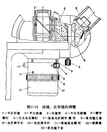 檢查半五角棱鏡的位里是否正常,可先將視場(chǎng)光欄調(diào)整在視場(chǎng)中心,并將它開大到與目鏡視場(chǎng)相同時(shí),把目鏡管下方的調(diào)節(jié)螺釘5旋松,將目鏡管扳轉(zhuǎn)90°,觀察視場(chǎng)中的視場(chǎng)光欄象是否發(fā)生偏移,如無偏移。說明半五角棱鏡的位置正常,若發(fā)生偏移,可將單筒目鏡管組卸下,把圓柱頭螺釘9旋出,將半五角棱鏡連同鏡座一起卸下,再旋松圓往頭螺釘4,根據(jù)視場(chǎng)光欄象的偏移情況,微調(diào)半五角棱鏡的位置,直至無論怎樣轉(zhuǎn)動(dòng)目鏡管,均觀察不到視場(chǎng)光欄象位置發(fā)生偏移為止。調(diào)整完畢,應(yīng)將圓柱頭螺釘4重新旋牢。