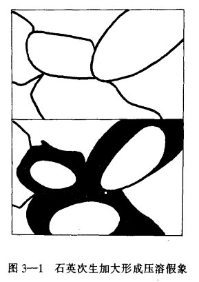在碎屑巖儲層中,硅質膠結作用有時非常發(fā)育,它可以把巖石的孔隙及喉道部分或全部充填膠結,使孔隙空間遭受嚴重破壞。硅質膠結通常以石英的次生加大形式出現(xiàn)而向著孔隙增長,以具有枯土質膜或不具有枯土質膜的產狀形成于顆位周圍。硅質膠結非常發(fā)育時,會從外表上改變順粒之間的關系,使分散的顆粒變得緊密接觸,形成壓溶作用的假象。