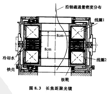 電子偏光顯微鏡中用到的磁透鏡都是第3種結構,即由線圈、鐵殼和極靴組成。只是極靴的間晾和孔徑不同,透鏡的強度有所不同,物鏡和投影鏡為強磁透鏡,它們有很高的放大倍數,聚光鏡相對較弱,而中間鏡更弱一些。圖8.3-8.5是幾個實際磁透鏡的簡化剖面圖。圖8.3是一種長焦距聚光鏡,它的焦距f和球差系數Cs的大小在同一數量級上,間隙s和極靴孔直徑D都是8cm。