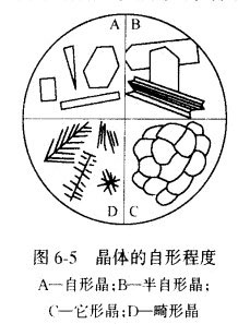 根據(jù)晶體邊棱的規(guī)則程度,晶體形態(tài)可分為邊棱規(guī)則完整的自形晶、部分邊棱完整的半自形晶、無規(guī)則形狀的它形晶及一些特殊形態(tài)的晶體(如圖6-5),通常呈針狀、條狀、柱狀、板狀、粒狀、纖維狀、放射狀、葉片狀、樹枝狀、包裹狀、花環(huán)狀、氣孔狀等。這些不同形態(tài)的晶體聚合在一起,就組成了各種各樣的顯微結(jié)構(gòu),如等粒狀結(jié)構(gòu)、斑狀結(jié)構(gòu)、玻璃狀結(jié)構(gòu)及氣孔狀結(jié)構(gòu)等。根據(jù)晶體的形態(tài)及所表現(xiàn)的各種顯微結(jié)構(gòu),就可推知晶體的形成工藝和判斷產(chǎn)品的質(zhì)量,使顯微結(jié)構(gòu)分析服務(wù)于生產(chǎn)。